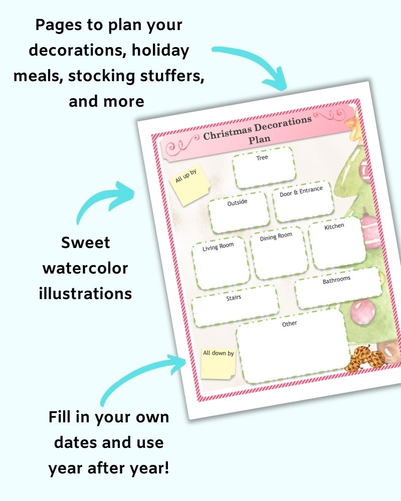 Sweet watercolor decorations adorn this undated planner that you can print and use year after year.